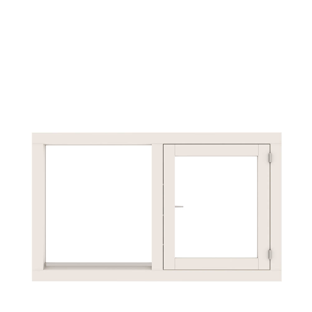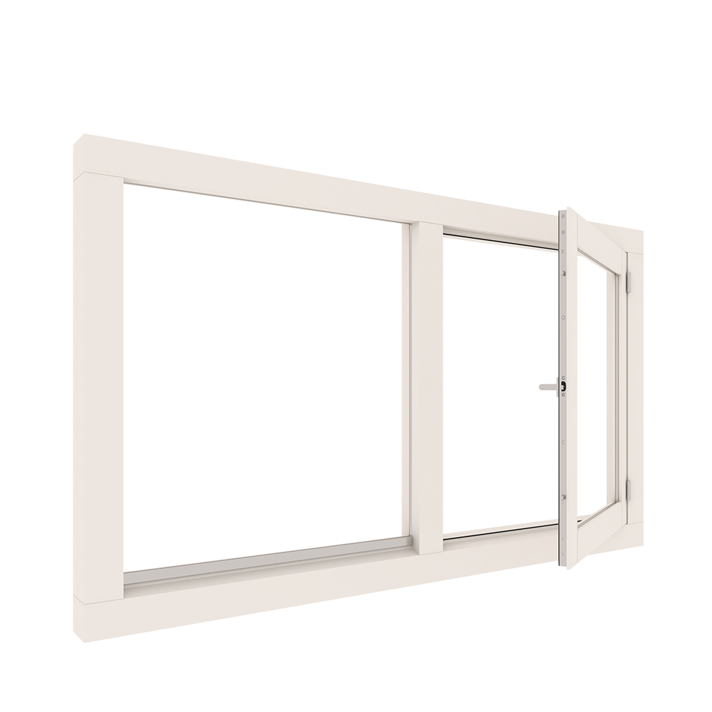 Dit houten kozijn bestaat uit 2 vakken die naast elkaar zijn geplaatst. In het rechtse vak zit een draairaam die naar buiten draait. Dit kozijn wordt veel gebruikt in slaapkamers.