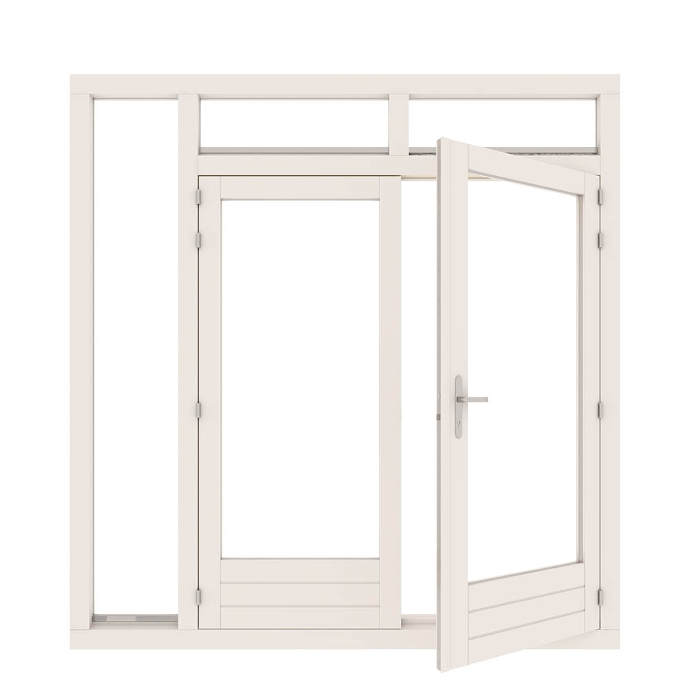 Deze tuindeur heeft dubbele openslaande deuren. Boven de deuren worden naast elkaar 2 bovenlichten geplaatst. Je hebt de optie om in de bovenlichten klepramen te plaatsen. Aan de linkerkant van de deuren wordt een raam in de hoogte geplaatst. Dit is een zijlicht. De deur wordt rondom voorzien van een tochtstrip. Hierdoor heb je geen last van geluid en tocht binnen. Door de vele opties in ons stappenplan is bijna alles mogelijk.